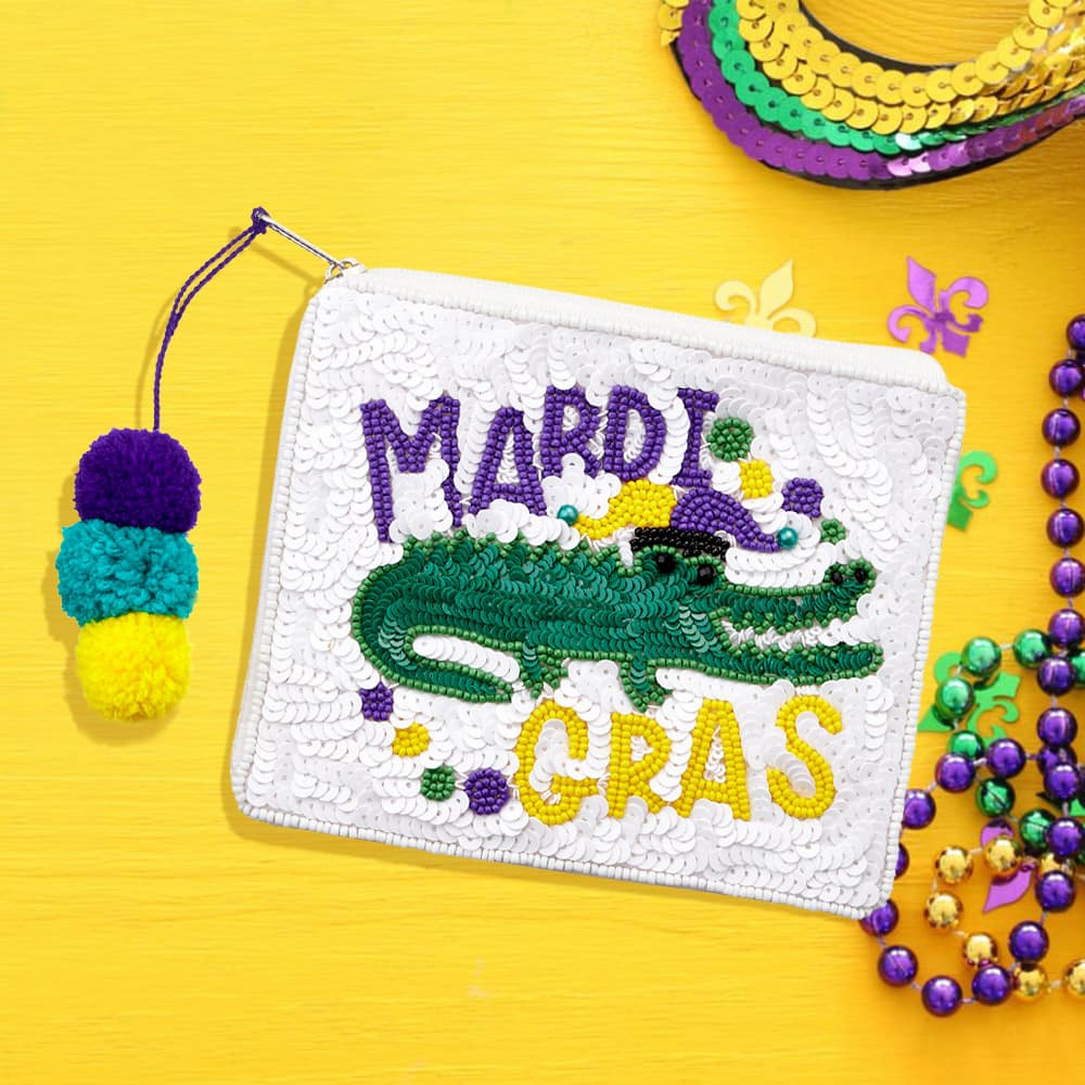 Sequin Seed Beaded Mardi Gras Message Alligator Pom Pom Mini Pouch Bag