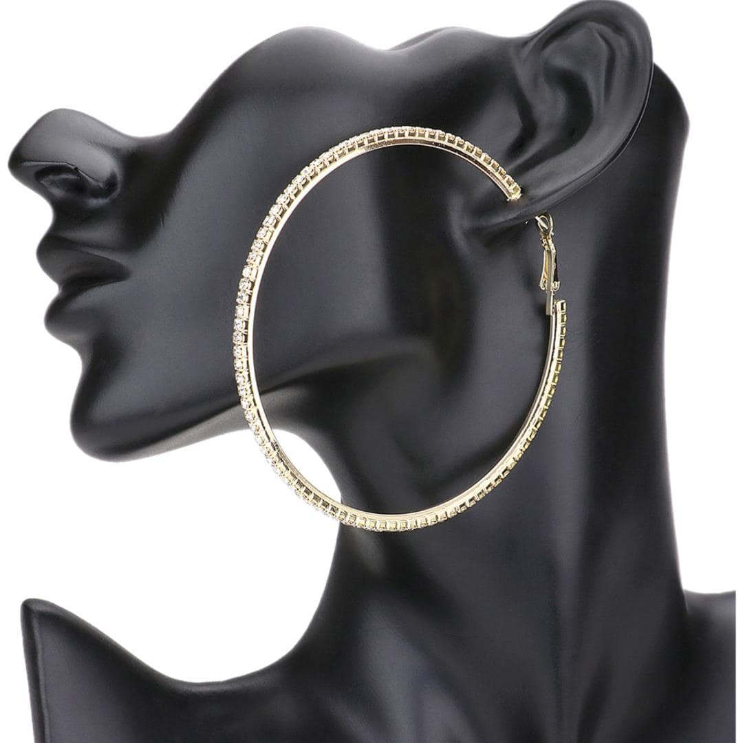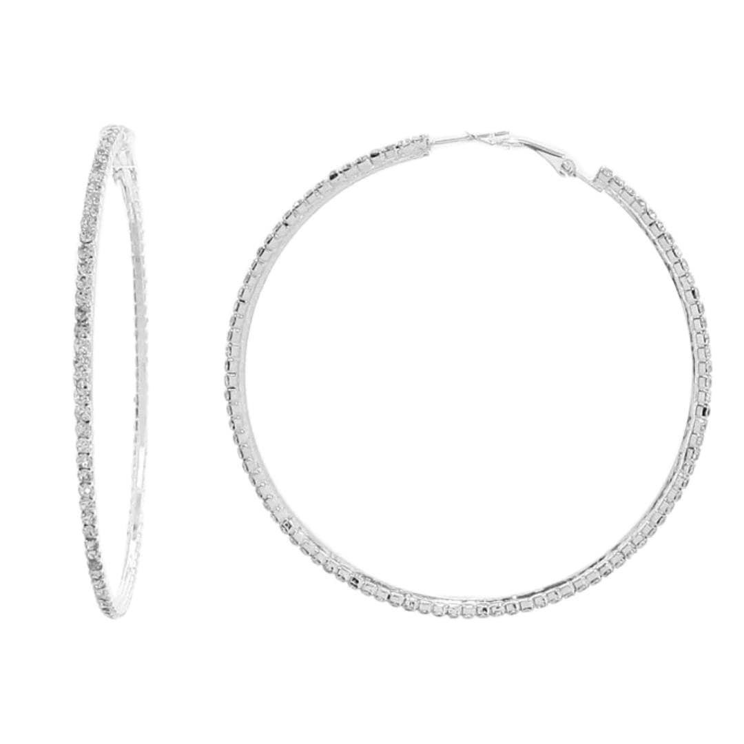 These silver hoop earrings are beautifully designed with rhinestones on the entire outer layer of each earring. They will compliment any outfit.