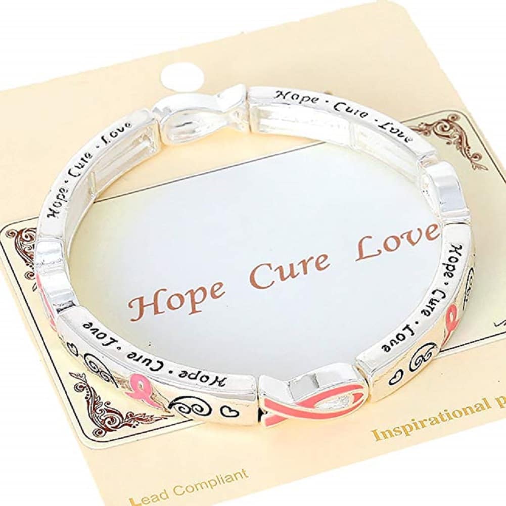 - “Hope Cure Love” pink ribbon symbol stretch bracelet